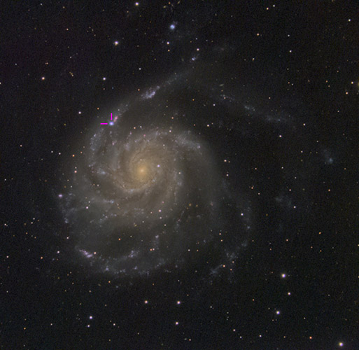 | Supernova SN2023ixf was discovered 19 May 2023 by the Japanese researcher Koichi Itagaki. This image was taken by me a few days later on 24 May 2023. It's a type II supernova i.e. a core collapse supernova. The position of the supernova is marked in the image. The colour of the supernova should be a lot more blue than this but unfortunately it saturated the sensor pixels.