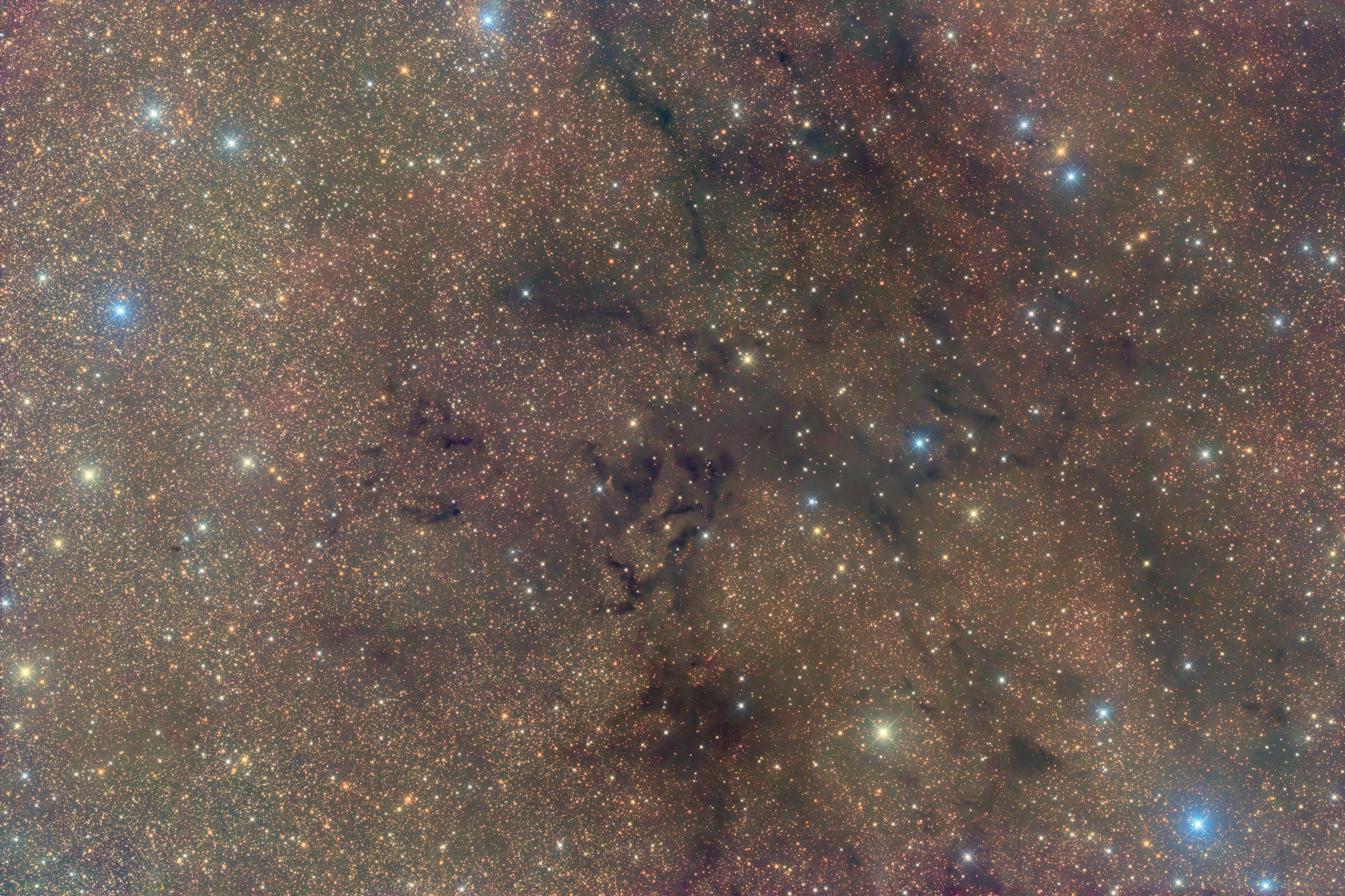 | Stacked in PixInsight, white balanced with SPCC, colour correction matrix applied and stretched with Arcsinh Stretch (to preserve hue and saturation) then sRGB gamma curve applied