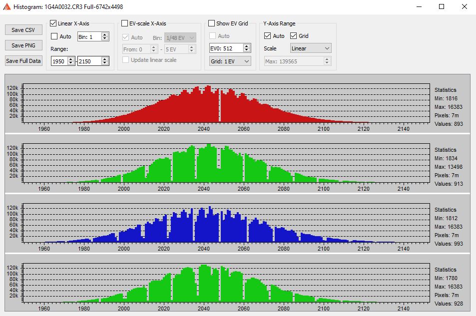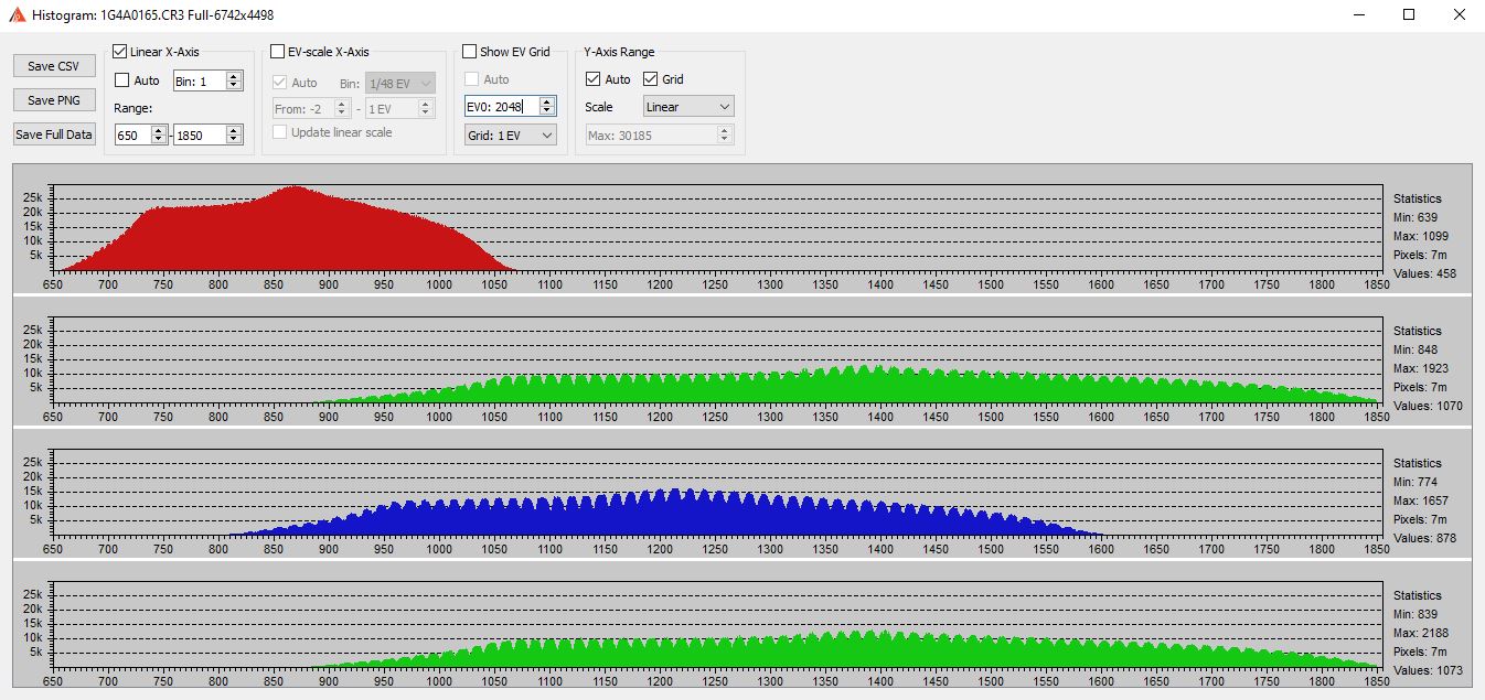 The Canon EOS R appears to perform digital scaling (known as white balance pre-conditioning) to the colour channels, which leaves regularly spaced gaps in the histogram of the green and blue channels.