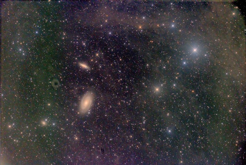 This image used dusk sky flats which of course are blueish instead of the brown (light pollution) background of the light frames. Obviously the image is very highly stretched in order to bring out the IFN (integrated flux nebulosity) in the background. Note the weird vertical green swathe in the left hand quarter of the image adjacent to the purple swathe in the background of the M81 and M82 galaxies.