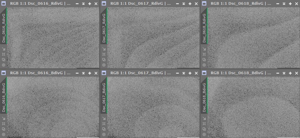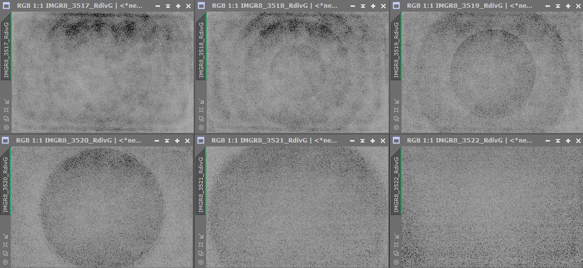 Here is a typical result showing 6 exposures from the sequence (for a Canon EOS R8), dividing the red channel by the green: