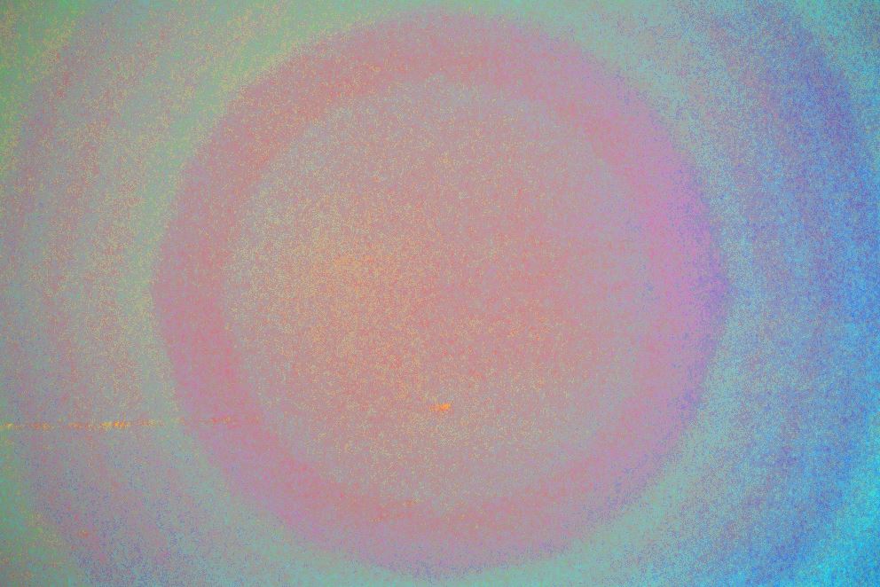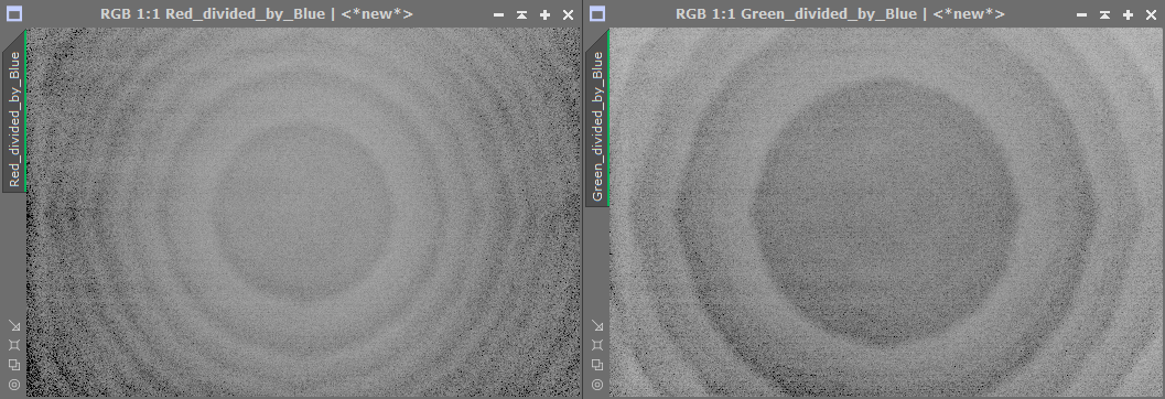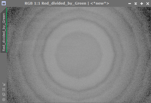 The left panel shows the result of dividing red by blue and the right panel shows the result of dividing green by blue. They both show a simple clear progression of "polygonal" rings which in turn indicates that those rings are embedded in the data of red and green channels but not the blue. On the other hand, dividing the red channel by the green gives the following result: