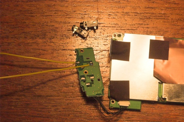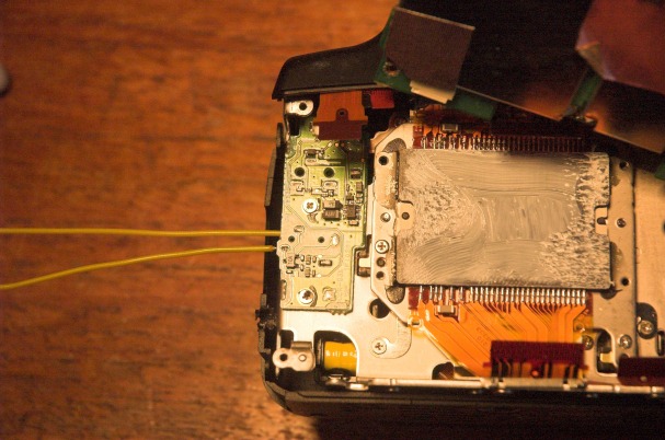 A couple of wires are soldered on in the position of the remote control socket so a new one can be constructed later, outside the camera body: