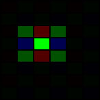 A star that spreads to a 3x3 block is slightly more complex. If the central pixel is red or blue then the centre of the star is punched out, as the following before and after diagrams demonstrate: