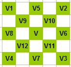 For any particular pixel V, the original algorithm examined the values in the 8 neighbours V1-V8. The new algorithm instead uses the 4 immediate diagonal neighbours V9-V12 and the 4 orthogonal neighbours V5-V8. The algorithm can be implemented in pseudocode as follows: