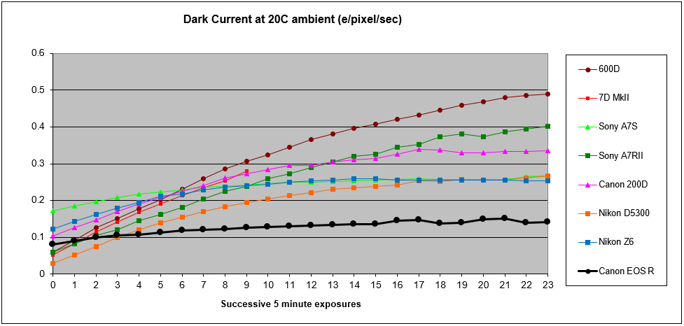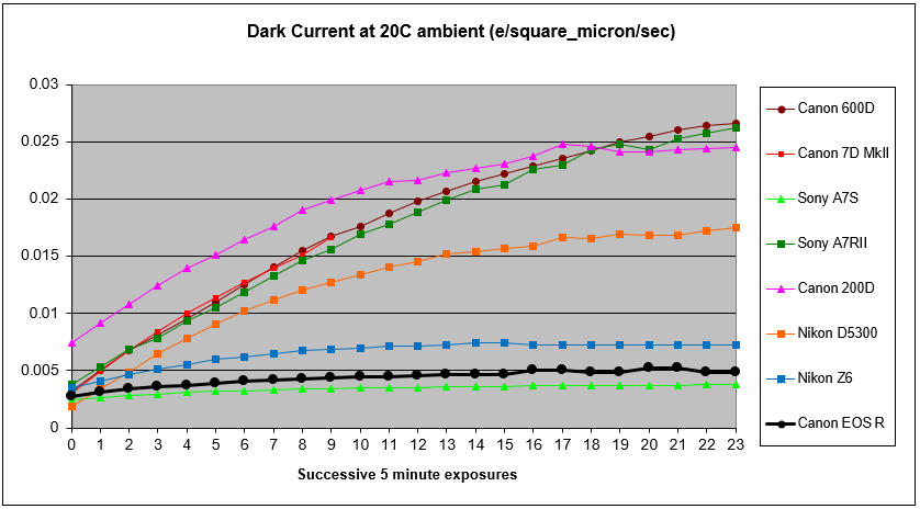 My methodology for testing dark current and self-heating is to put the camera in a dark room at 20C ambient temperature and leave it to acclimatise for an hour or two. I then switch the camera on and immediately run a couple of hours of consecutive 5 minute dark frames with the rear LCD folded out from the rear of the camera to allow heat dissipation. By subtracting each frame from the previous one, the thermal noise can be calculated and ultimately converted into dark current.