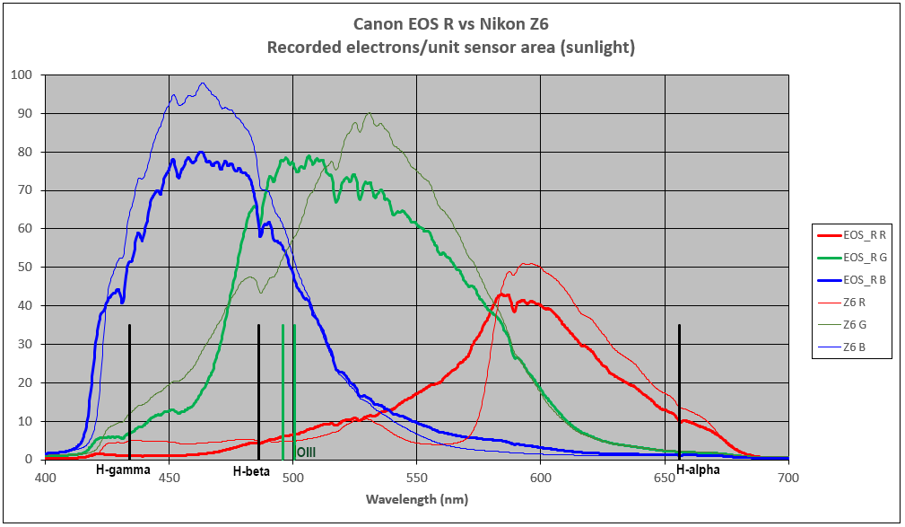 The overall shape of the curves is very typical of the difference between Sony and Canon sensors. The sensitivity of the Nikon Z6 peaks higher than the Canon EOS R in all three colours channels and has a 25% higher response at the all important H-alpha wavelength.