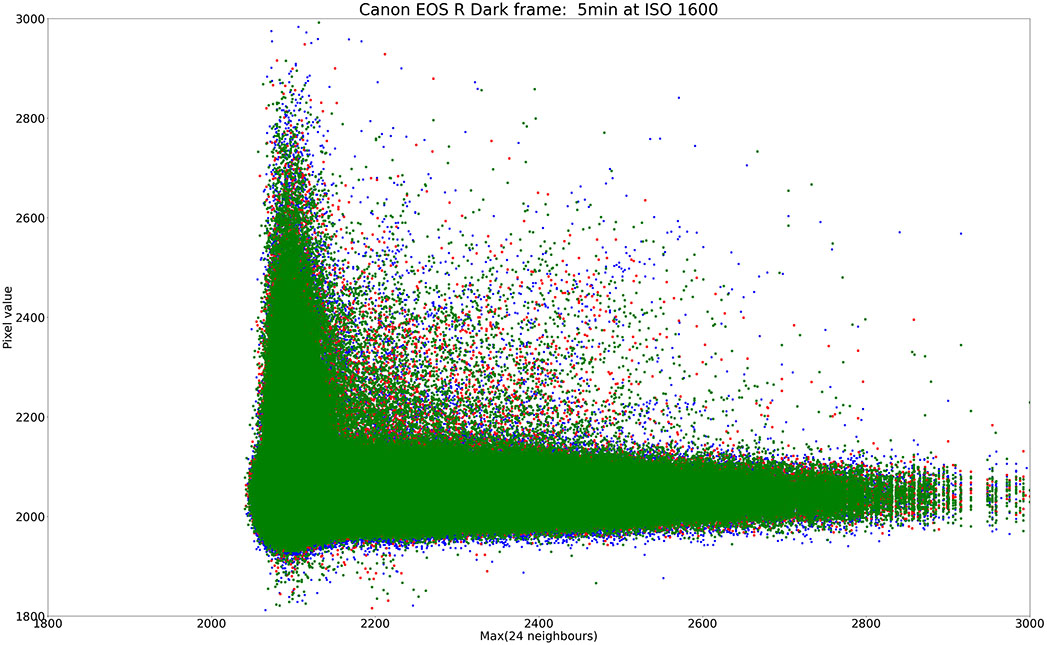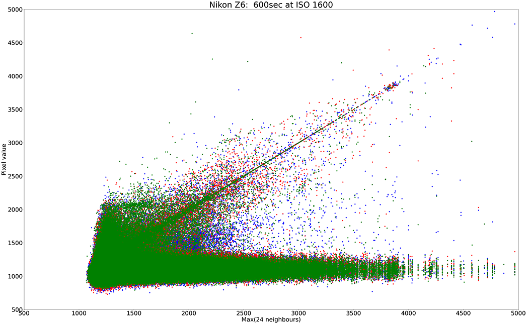 Here's an example plot from a 5 minute dark frame of a camera without raw data filtering (the Canon EOS R). Every pixel value is plotted against the maximum of its 24 neighbours in a 5x5 square block surrounding the pixel: