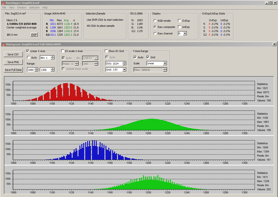 In contrast here is the plot from a 5 minute Nikon Z6 dark frame: