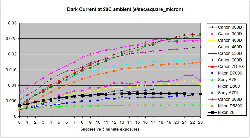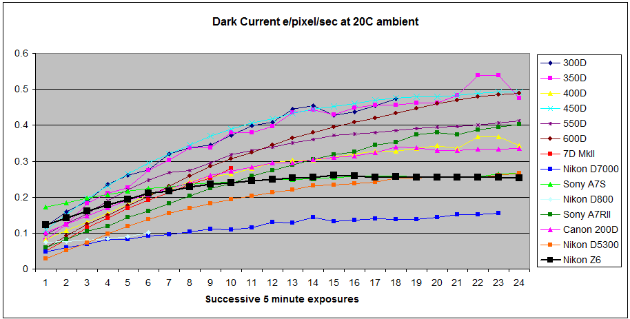 My methodology for testing dark current and self-heating is to put the camera in a dark room at 20C ambient temperature and leave it to acclimatise for an hour or two. I then switch the camera on and immediately run a couple of hours of consecutive 5 minute dark frames with the rear LCD folded out from the rear of the camera to allow heat dissipation. By subtracting each frame from the previous one, the thermal noise can be calculated and ultimately converted into dark current.